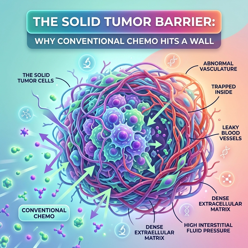 The primary reason conventional treatments fail in solid tumors isn’t always a lack of potency: it’s a lack of access. Solid tumors utilize a dual-layered defense system composed of structural (physical) and fluid-dynamic (physiological) barriers.
